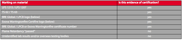 Thankfully, it is easy to identify scaffold sheeting certified that has authentic third-party approval. Suppliers of scaffold sheeting should provide a test certificate from LPCB or Exova Warringtonfire to prove certification. Materials that have third-party approval must display the appropriate approval mark logo (LPCB or Certifire), certificate number and compliance to BS7955 printed on the label/ID strip and the sheeting at regular intervals. If this does not appear on the sheeting, it does not have accredited third-party approval, regardless of what is claimed by the manufacturer. Below is a checklist of the marking displayed by certified products, as well as markings which falsely suggest certification.