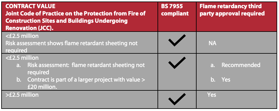 Beyond the immediate concerns of fire prevention and improved Health & Safety on day-to-day site activities, failure to use certified scaffold sheeting on developments of a certain value has wider implications, potentially causing the ceasing or withdrawal of insurance in relation to the Joint Code of Practice on the Protection from Fire of Construction Sites and Buildings Undergoing Renovation (JCC). The terms of JCC require different stipulations for different projects, with the need for third party-approved flame retardancy certification determined by the value of the project, as outlined in the table below.